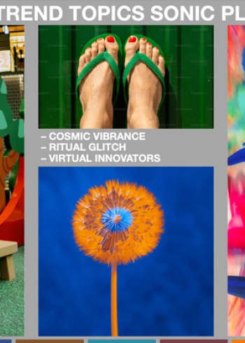 Das Thema SONIC PLURIVERSE besticht durch eine dynamische Farbwelt. Das optimistische, kraftvolle Farbuniversum verbindet virtuelle Strahlkraft mit Naturnähe und Eleganz. Looks der 60er-Jahre werden mit alltagstauglicher Allüre umgesetzt. Spitze, Häkle-Details und Transparenz verleihen sportlichen Outfits eine überraschende Note.